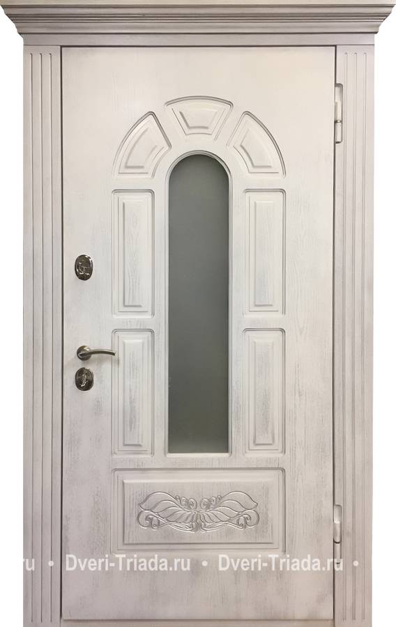Остекленная входная термодверь с карнизом и панелями МДФ с патиной Арт-355